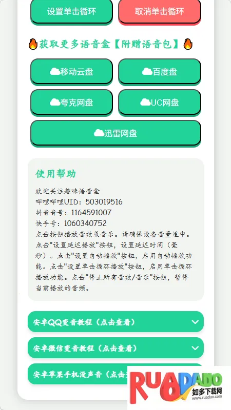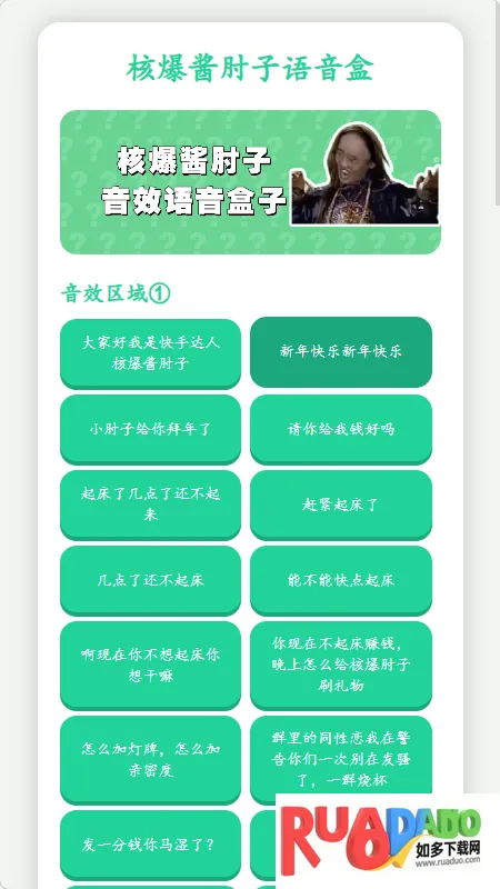 核爆酱肘子语音盒是快手网红语音包工具,实用简便,内置丰富音频资源,界面简洁。使用时点击素材播放,有控制区域,支持暂停定时等。还有 QQ 微信变音教程及多样音效、音乐区域,功能设置丰富。