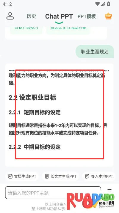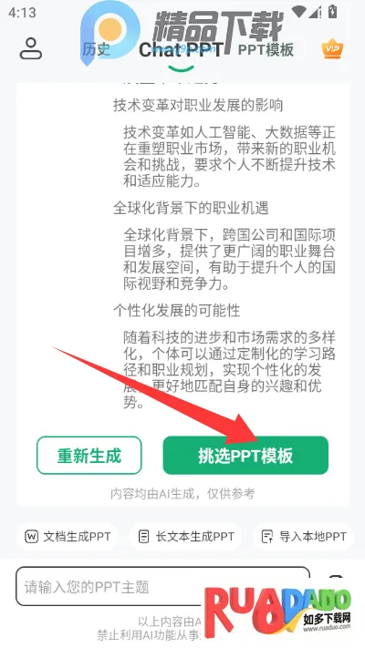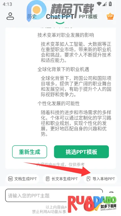 ChatPPT一键生成ppt软件2026最新版本,是基于AI的PPT生成工具。支持对话式指令等,能快速生成精美文稿。有海量模板与智能美化功能,全链路智能生成,适配中文场景,全维度美化,还提供演讲辅助,跨平台兼容多种格式。