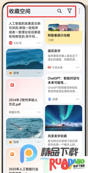 3. 它会将用户主动留存的内容自动收入收藏空间,文档也能直接三指下滑保存。