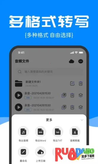 想精准把录音转为文字?用这款软件就行!它是集专业录音、录音转文字、视频转文字、音频转文字、语音转文字等功能于一体的移动应用软件。能提供语音识别转写、音频裁剪处理、格式转换等多样化服务。不管是日常办公会议记录、媒体采访还是录音取证等场景下的录音转文字需求,它都能满足。语音识别后的内容可一键复制、快速导出。它还有语音翻译功能,能在线实时翻译,多国语言互译。支持多种文件格式自由转换,像mp4转mp3、FLAC等。音频能剪切、分割、合并、变声、添加背景音。还能实时录音转文字,导入外部文件转文字。商务人士洽谈、开会能便捷整理关键信息;记者采访不用担心信息遗漏,快速出稿;学生可录下重点难点课后复习;白领能轻松搞定各类会议记录。有了它,精准录音转文字超轻松!
