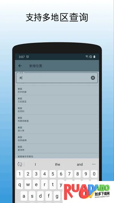 2. 点击添加城市按钮,可通过搜索或列表选择关注地区,所选城市时间清晰显示。