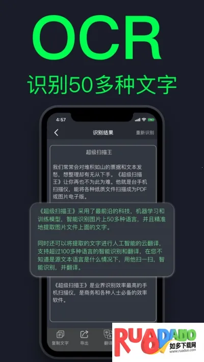 2. 图片转文字:OCR智能识别文字,多达41种语言,图片中的文字也能高亮搜索编辑或导出WordTXT格式。