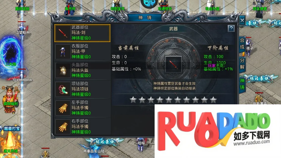 4. 玩法丰富,装备合成、升级技能、神铸武器、角色转生等可提升属性。