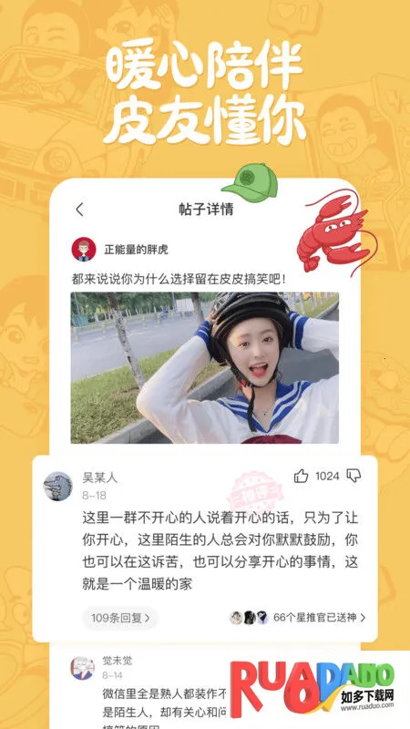 皮皮搞笑是一款以90后沙雕网友为核心的搞笑短视频图片段子社区app,传递快乐温暖。有搞笑视频、脑洞神评等,兼顾多类别,能互撩交友、发布内容,还可通过关注近似加好友,让生活充满欢笑。