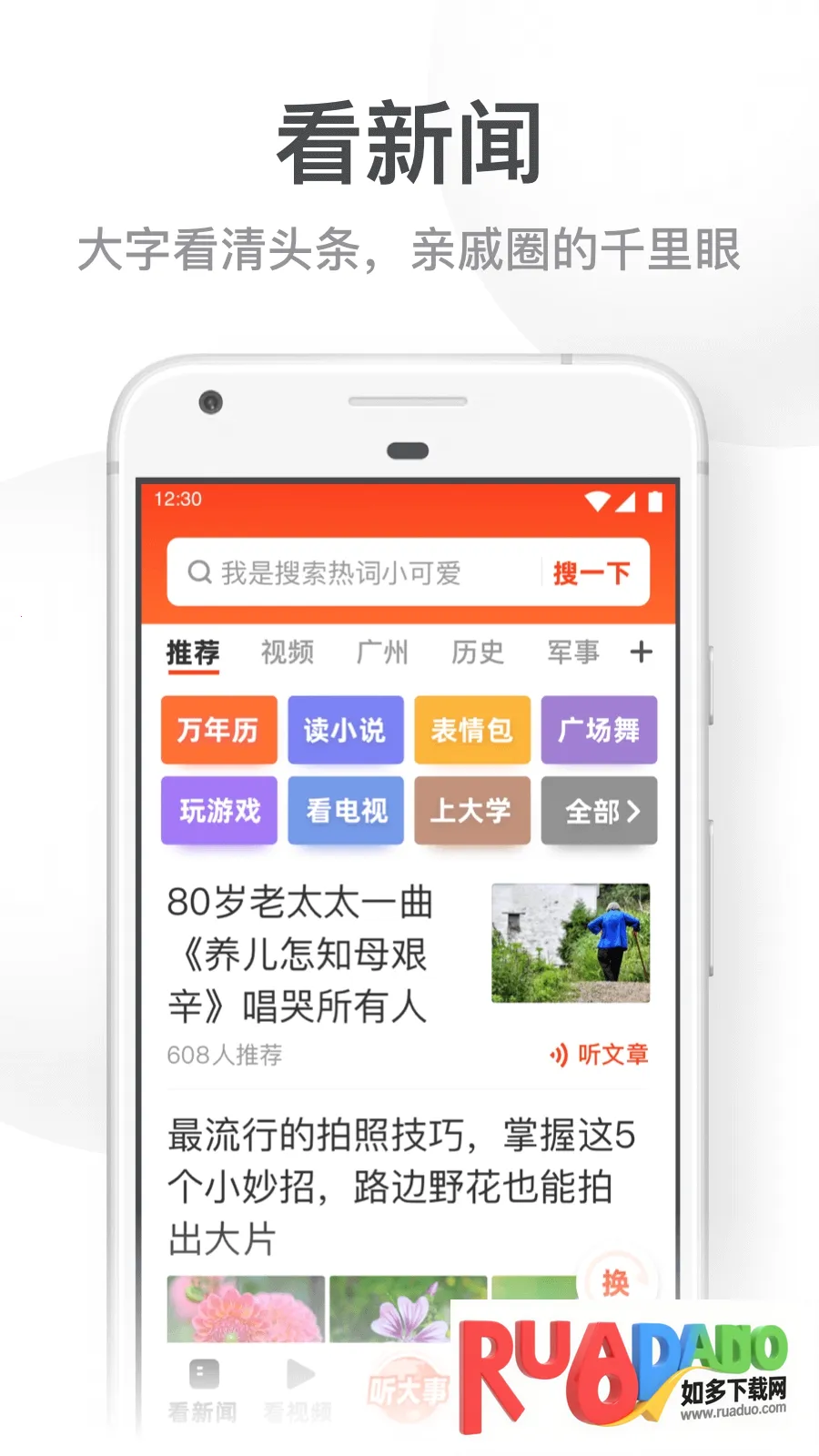 UC大字版是专为叔叔阿姨设计的资讯阅读休闲娱乐产品。大字看新闻更清,听新闻看小说便捷,有丰富祝福表情。还具备海量视频、小游戏等,省流又好用,还有签到福利,能让老人轻松享受休闲时光。