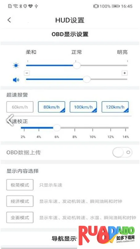 1. OBD 信息标准抬头显示,涵盖车速、油耗、各种报警等,达原车级别 HUD 显示