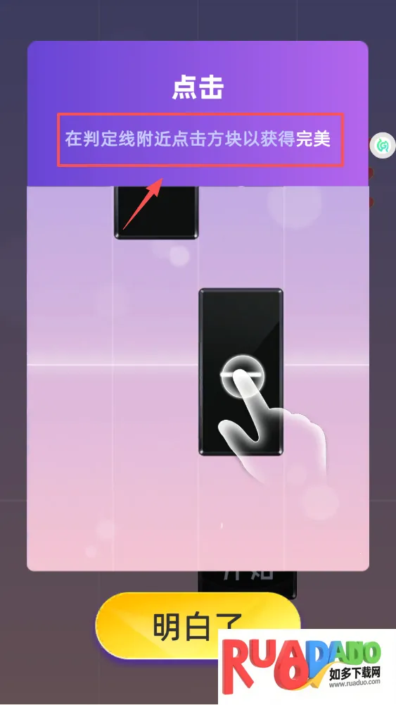 2、游戏遇到下落方块别慌张,看准时机在判定线附近轻点它,跟着节奏操作,多练几次就能掌握手感了。