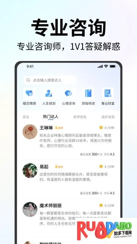 4. 平台咨询师信息丰富,咨询记录自动保存,热门达人自动推送,方便选择与回顾。