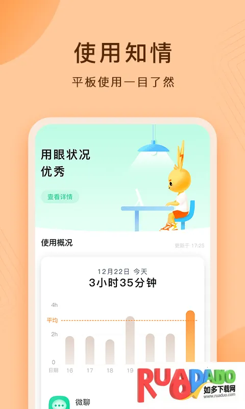 护眼平板(平板使用管理)是小天才护眼平板手机端配套 app,能让家长了解孩子用眼习惯、使用时长等,可进行应用管理、下载管控、上网审核,还能通过微聊轻松沟通,全方位守护孩子平板使用。