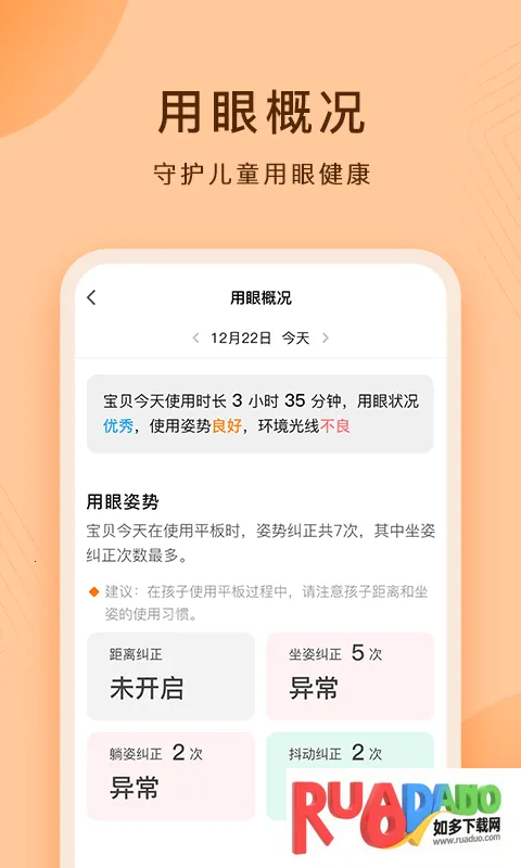 1. 用眼概况:家长能在APP上知晓孩子使用平板时的用眼习惯、姿势及环境光线。