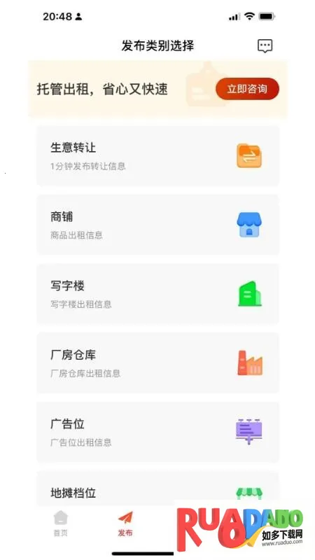 招商通2026官方正版是专注招商转租的软件,能一键发布商铺等出租转让信息,实时更新并分类推荐,支持在线沟通、电话联系等,资源多样,沟通便捷,精准匹配需求,助力轻松高效招商。