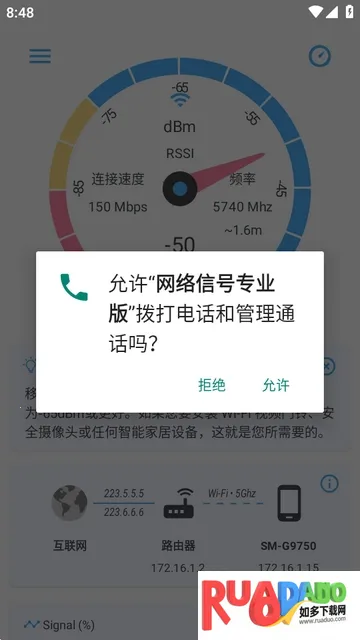 使用也简单,下载安装后获取应用权限,允许电话管理权限,打开就能查看wifi信号强度,还能看手机流量信号。左上角菜单可查看信号信息和设置,能按习惯设置显示效果。有了它,轻松解决网络信号弱问题,多维度评估无线信号质量,让你随时掌握家中真实网络质量状况,上网更顺畅!