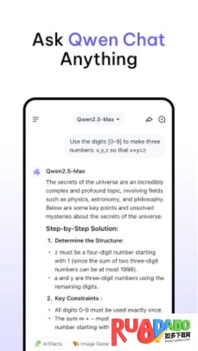 Qwen Chat是智能学习问答软件,能为手机提供专业智能管家。遇学习问题可咨询,调用网络教学数据解答。有持续学习等功能,亮点是响应快、兼容好、体积小,特色是可打发时间、对网速要求低、加密隐私,界面简洁易上手。