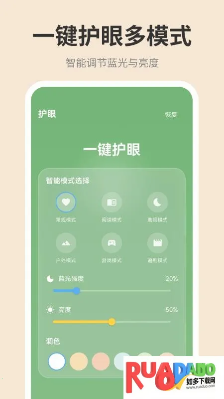 手机屏幕iDim亮度调节2026最新版本是免费护眼神器,集屏幕调节与眼部保健于一体。适合长期用眼人群,能科学护眼。界面操作简单,可手动调亮度蓝光。有个性化护眼模式、眼球训练等,还能测眼况、创专属模式,适配多场景。