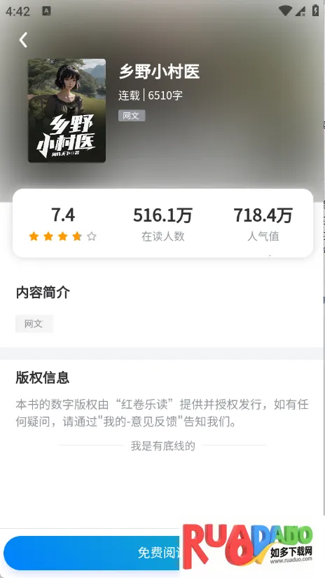 红卷乐读是小说阅读 APP,实时推送新书,分男女频道精准推荐。支持自定义,有夜间模式。多种翻页与设置,更新有提示。榜单实用,多设备同步。无充值界面,精准推荐,可弹幕评论,畅享免费阅读。