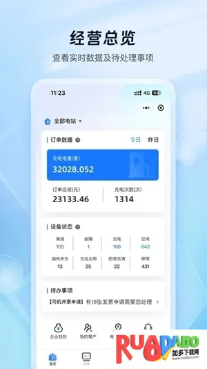 2. 运营数据统计,直观展示充电次数、电量消耗及收入情况。