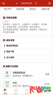 观吾道历是融合传统道家文化与现代生活的智能日历应用。由专家审校,离线可用,不渲染焦虑。呈现每日黄历、节气等,有个性化择吉等服务,独创三历同显界面,还有多种特色功能与优势。