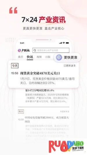 产联社是一款能满足企业机构及行业从业者多种需求的软件。它提供海量精准及时全面的产业动态资讯,不管你是做企业战略规划、市场研究还是投资分析,它都能帮上忙。其特色功能超实用,AI智能个性化推送,根据你的兴趣和行为精准推荐定制化资讯;7x24小时实时更新,随时带来最新产业动态和政策资讯;还有深度趋势预测分析,结合大数据和AI算法,提供权威行业走势预测;多个维度智能搜索,支持关键词、行业、时间等多条件组合筛选。软件亮点也贴心,能轻松设置字体大小。优势更是显著,定期发布热点专题和行业报告,数据可视化展示,多个终端无缝对接,支持手机、平板及PC端同步使用,还能根据用户行为分析反馈持续优化,支持离线浏览与收藏夹,方便随时查阅关键资讯。有了产联社,你的工作将更加高效便捷。