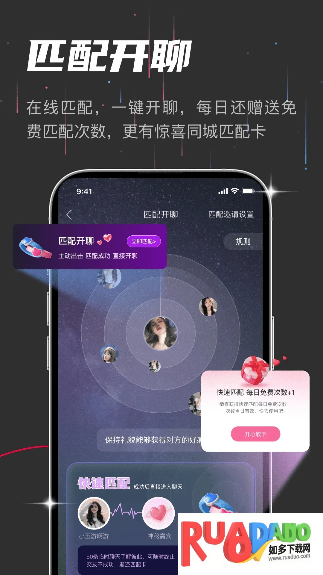 3、智能匹配算法,按用户资料和偏好精准推荐合适交友对象。