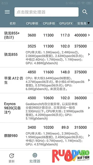 2. 可了解市面上主流手机处理器的性能得分。