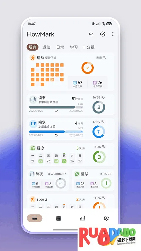 FlowMark官方最新版是习惯养成与管理软件,有灵活定制打卡模块、智能定时提醒等功能。支持多场景打卡,可自定义计划,通过数据回顾分析养成趋势,操作简单,免费试用,助力培养良好习惯。