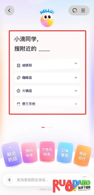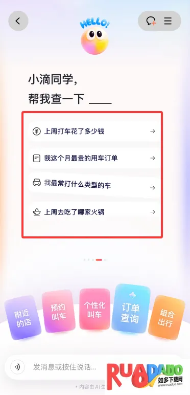 滴滴AI出行助手小滴超实用!它能帮你个性化叫车,自由选车辆条件。还能直接查询以前的叫车订单。让它规划出行路线,或者预约叫车也很方便,它能根据实时路况等信息,给出最优路线建议,节省出行时间。它还能搜索附近地点并规划路线,出行超省心。出发前,能精准预估到达时间,帮你合理规划出门时刻,避免久等。行程中,实时监测路况,拥堵时重新规划路线,还会提醒到站时间,周边服务信息也能提供。遇到恶劣天气,能推荐合适出行方式和路线;紧急事务时,优先匹配快速通行车辆和规划最快路线。总之,有了滴滴AI出行助手小滴,出行更便捷高效,各种问题都能轻松解决。