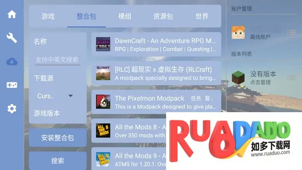 1、在启动器中点击整合包栏目可以看到详细的整合包资源;选择模组可以任意下载模组,这里支持中文英文搜索,可以按下载源,游戏版本,类型等等进行挑选