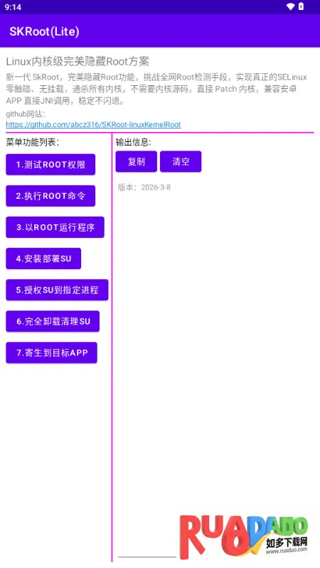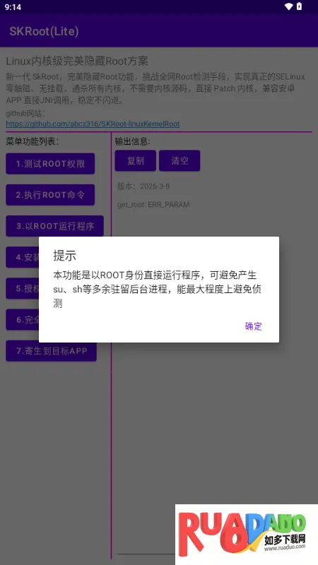 3.安装并启动或者,输入Root密匙值,即可正常使用SKRoot。skroot_lite.apktestRoot