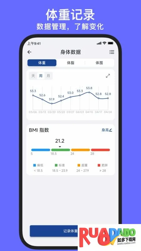 3. 可记录体重体脂体围等身体数据,以曲线图展示,方便查看进步与变化。