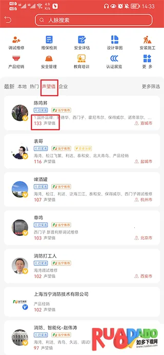 二、在旺财人脉界面中点击声望值,就可以看到企业以及个人所拥有的声望值了