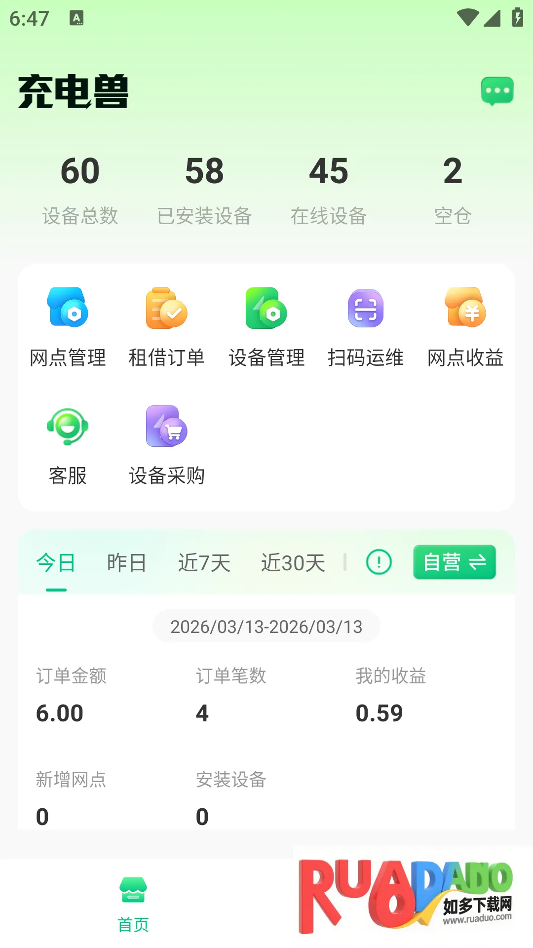 充电兽代理版2026是共享充电宝合伙运营代理端,为合作伙伴打造一站式业务管理平台。整合设备运维、订单查询、收益结算等核心功能,操作便捷,数据安全,能提升运营效率,助力代理商稳健经营。