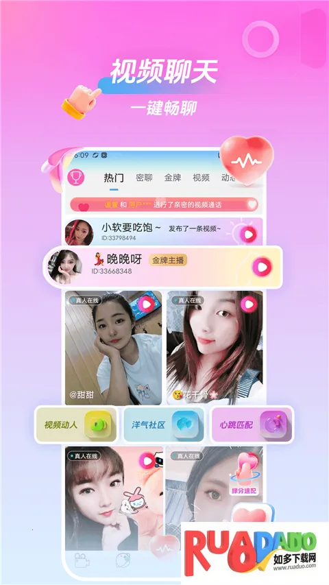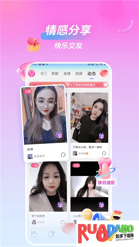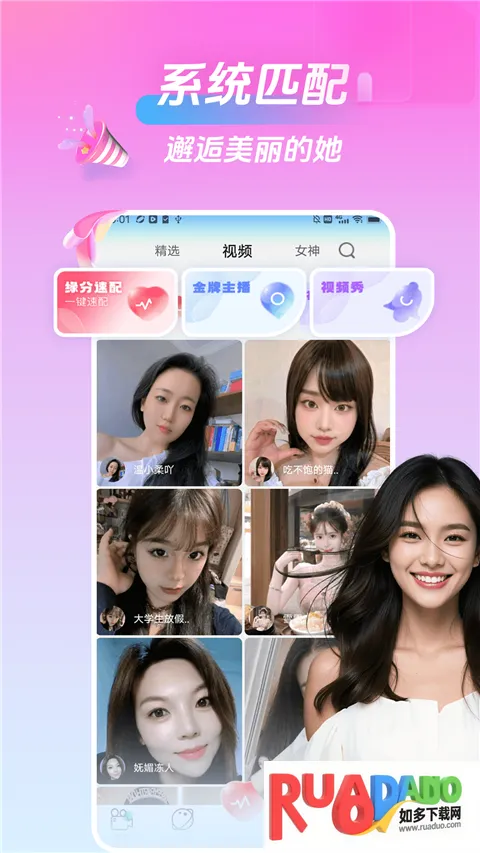 美桃花聊视频交友App是受年轻人喜爱的在线交友软件,以快速匹配直连真人为核心。有多种交友方式,设动态广场。能上下滑动选心仪对象,缘分速配快,还介绍了关注、解除拉黑及送礼方法,v2.3.0优化了体验。