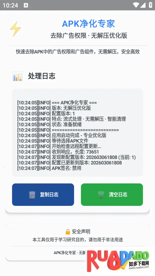 想去除软件的广告权限?咱有超棒的办法!就像有一款类似apk净化专家优化版的工具,能快速去除apk中的广告权限和广告组件。它不需要解压,安全又高效,还不怎么占设备资源,各种安卓设备都能适配,让你畅快运行。使用时,先在本站下载安装好软件,打开获取文件权限,然后选择要处理的apk文件,软件就会自动处理,下方还能查看处理日志。但要注意,此工具仅针对无需加载广告获奖励的应用,要是处理的应用需加载广告获奖励才能正常用,就千万别用,不然会导致无法加载广告。处理后用mt管理器对apk优化处理,不然可能无法安装或运行。它优势明显,高效便捷,不用复杂操作就能快速去除广告,节省时间;安全可靠,只清理广告权限和组件,不碰应用核心代码;还经过轻量化优化,适配各类设备,运行超流畅。有了它,去除广告权限不再难!