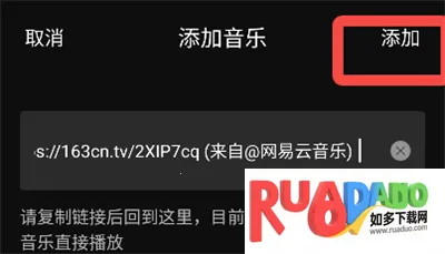 3、将想分享的歌曲链接粘贴到输入框(目前仅支持网易云的非会员音乐),点击右上角【添加】。