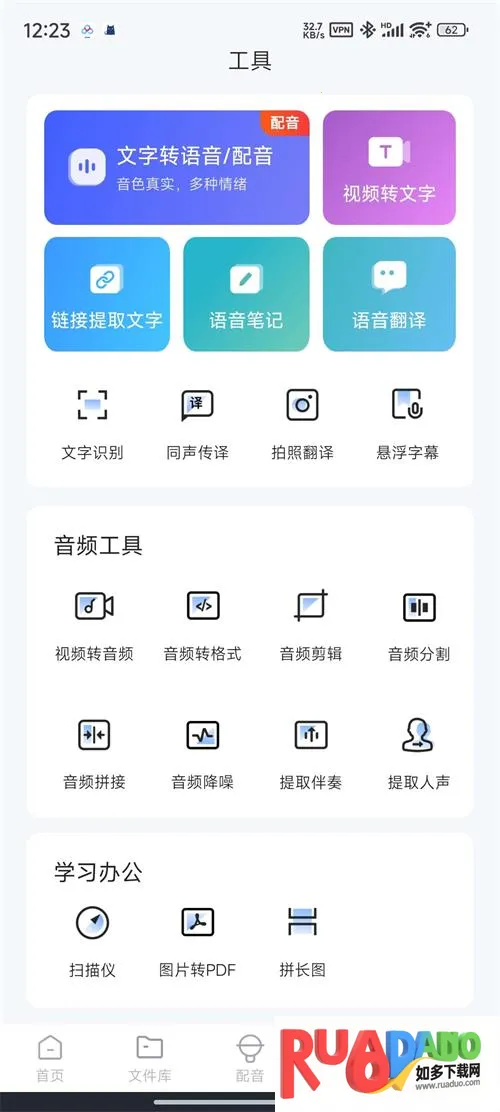 1. 整合多种音频工具,涵盖学习办公、文字转语音、视频转文字等,操作便捷。