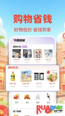 购物特价版商城最新手机版是特惠购物助手,严选全品类好物,覆盖多类目。每日更新限时秒杀与补贴,界面清晰,支持分类查找。一键领券下单,日常囤货或购数码服饰等都能低价嗨购,省钱省心。