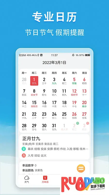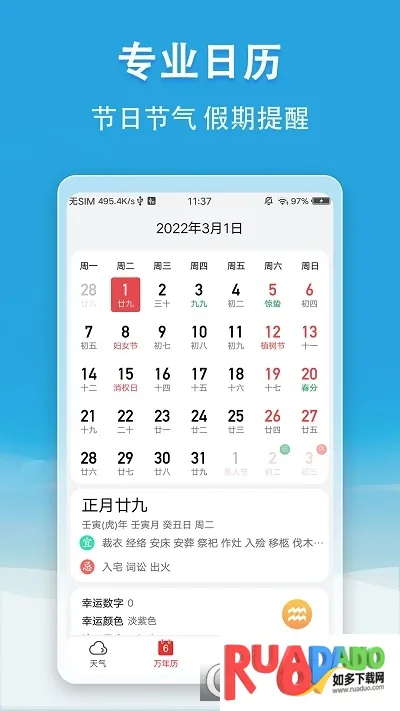 3. 生活拓展:结合月周日视图显示天气黄历宜忌、吉神方位,还有星座运势等。