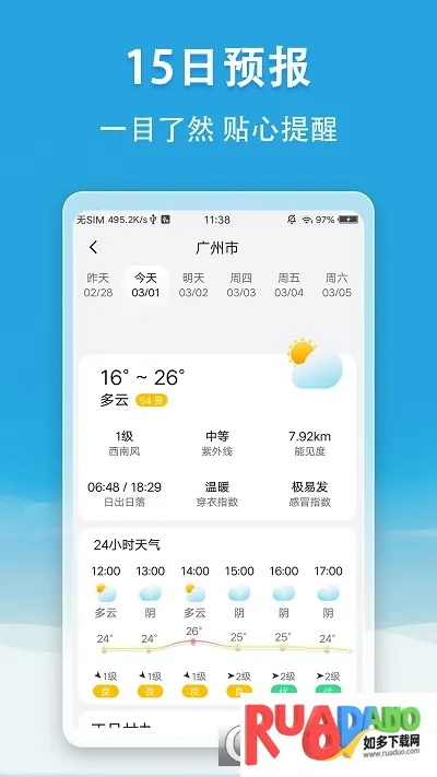 4. 新版特性增加中央气象台天气预报昨天和今天的早中晚天气播报,优化24小时15日天气降水概率提示。