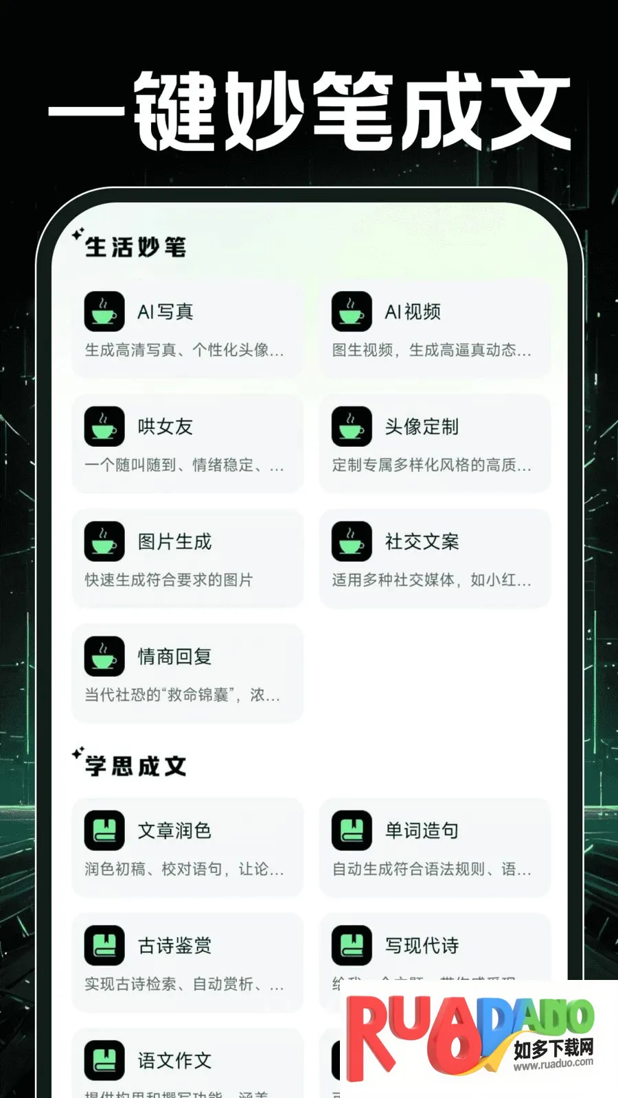 2、支持职场汇报文案写作、视频脚本等一键生成,还有AI写真创意视频生成等视觉创作功能,可满足多元创作需求。