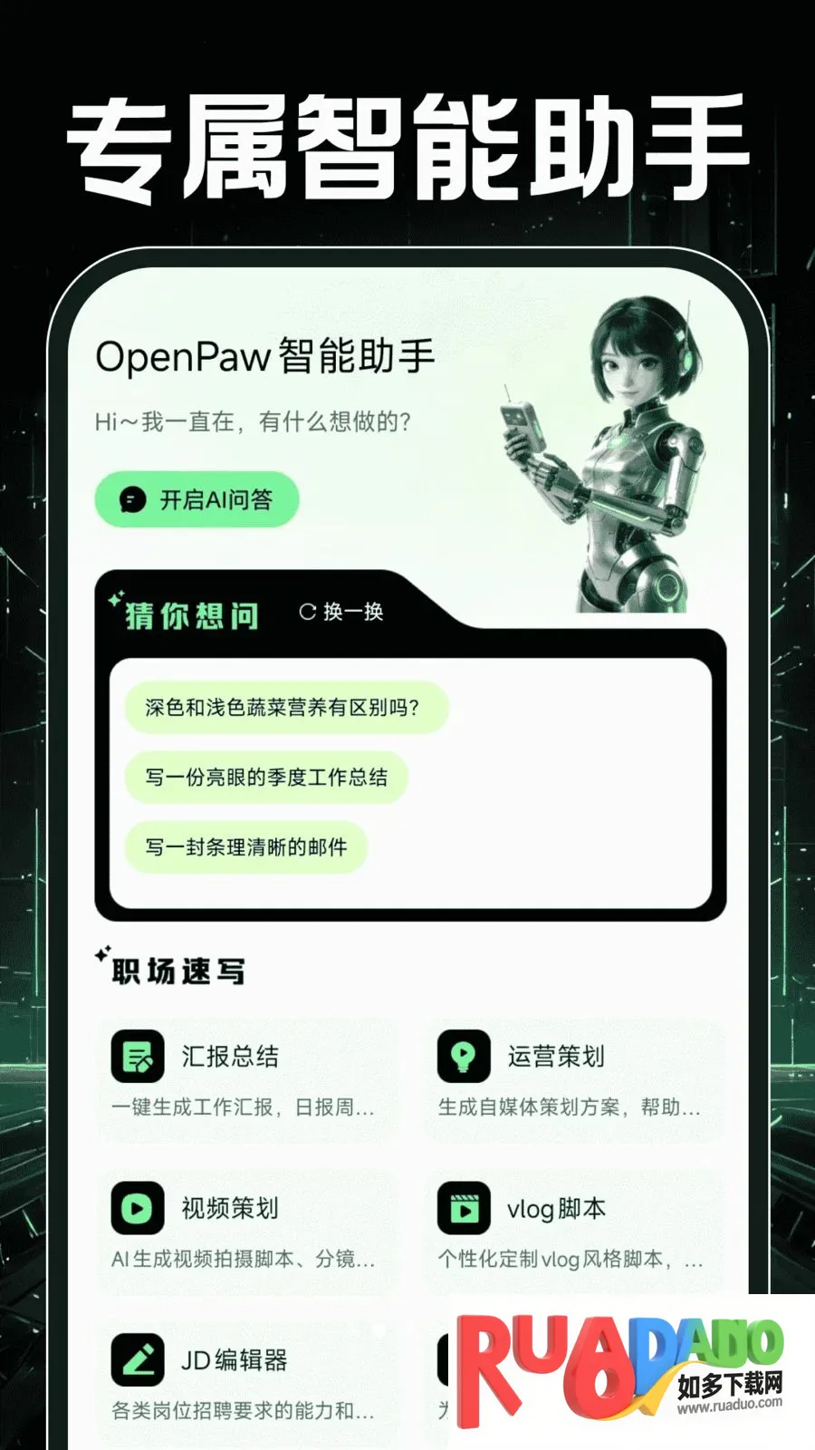 OpenPaw智能助手2026最新版本提供专属智能助手,实时答疑,支持一键生成职场汇报文案、视频脚本等,具备AI写真、创意视频生成等视觉创作功能,还有多事项管理工具,提供一站式智能便捷服务。