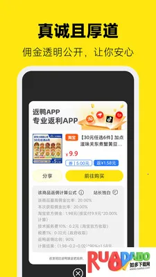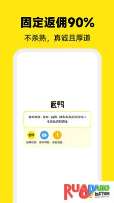 1、返鸭返利App返得多,不杀熟,固定返佣90,真诚又厚道。