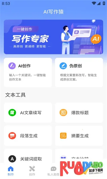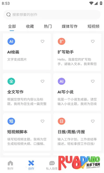 1、输入关键词,一键智能创作,提供丰富模板,可对生成的文案进行改写续写扩写生成摘要等,为您提供创意灵感,帮助您轻松写作。
