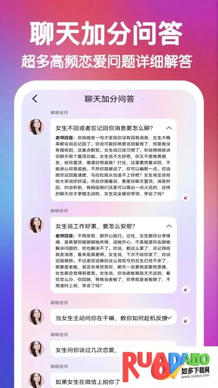 1. 海量恋爱聊天话术资源随时查找使用,能让人轻松聊天互动,学习各种恋爱聊天技巧。