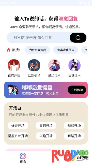 嘟嘟恋爱话术安卓版是专业沟通辅助工具,主打聊天回复键盘。有核心回复功能、多样风格,全场景覆盖,轻量实用。能解决聊天难题,提供海量恋爱话术资源,还有导师帮回等功能,助用户轻松聊天、提升情商、实现脱单。