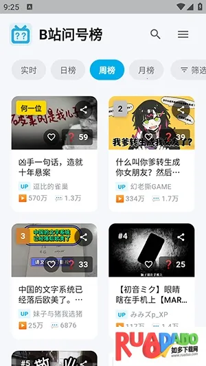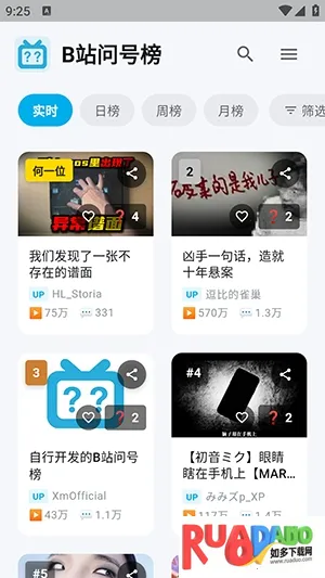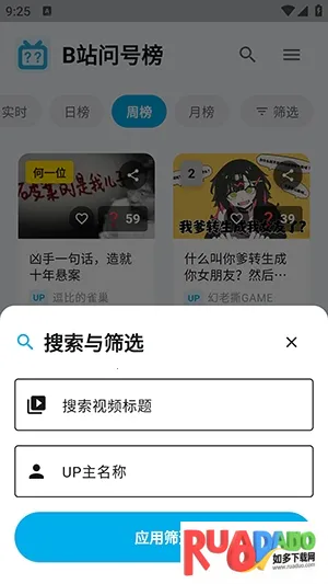 B站问号榜2026是第三方B站安卓应用,能一站式刷热门经典抽象作品。播放页自动同步原生弹幕,支持登录同步数据,可一键查看历史记录续刷。界面简洁,有多种榜单,还有问号点亮、弹幕联动等特色功能。