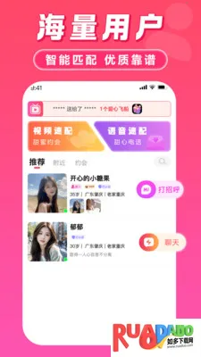 4. 一键匹配,可真人视频、语音聊天,零距离沟通,为找对象提供便捷高效的途径。