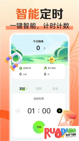 2. APP 支持定时定数自由三种跳绳模式,可自由设置跳转变数,一键开启智能计数,实时记录运动数据。