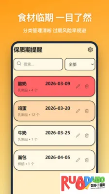它的功能超强大!支持手动录入物品名称、过期日期、分类及数量,还能随时编辑删除条目,灵活匹配各种管理场景。系统会自动比对当前时间与过期日期,划分已过期、即将过期、安全三个等级,搭配红橙黄三色视觉标记,直观呈现物品状态,避免遗漏。检索过滤功能超实用,支持名称分类模糊查询,搭配分类筛选,无需逐页翻阅,快速锁定目标物品。内置常用物品库,提供预设模板一键填充信息,省时省心。还能自主设定提前提醒天数,灵活开启或关闭全局通知,定制提醒模式,管理更契合个人需求。有了它,保质期管理变得简单高效,赶紧摆脱物品过期困扰,试试这款保质期提醒助手吧!