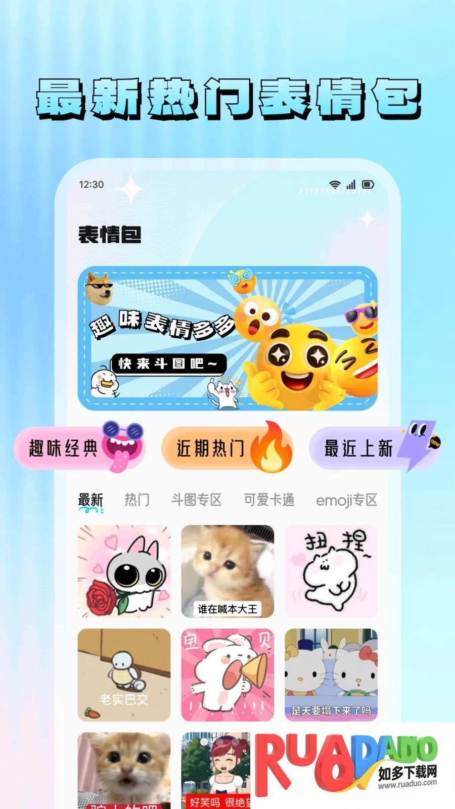 2、有海量热门表情包,斗图秒赢,还有全设备高清壁纸,动漫萌宠等多风格。