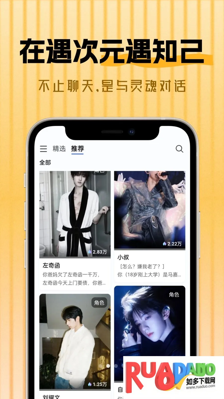 遇次元AI最新手机版,能让你与虚拟偶像近距离对话互动。通过对话和选择推动剧情,有海量原创角色库,每周更新。可代入不同角色体验多样人生,还新增虚拟对话,告别书荒,探索独特故事线。
